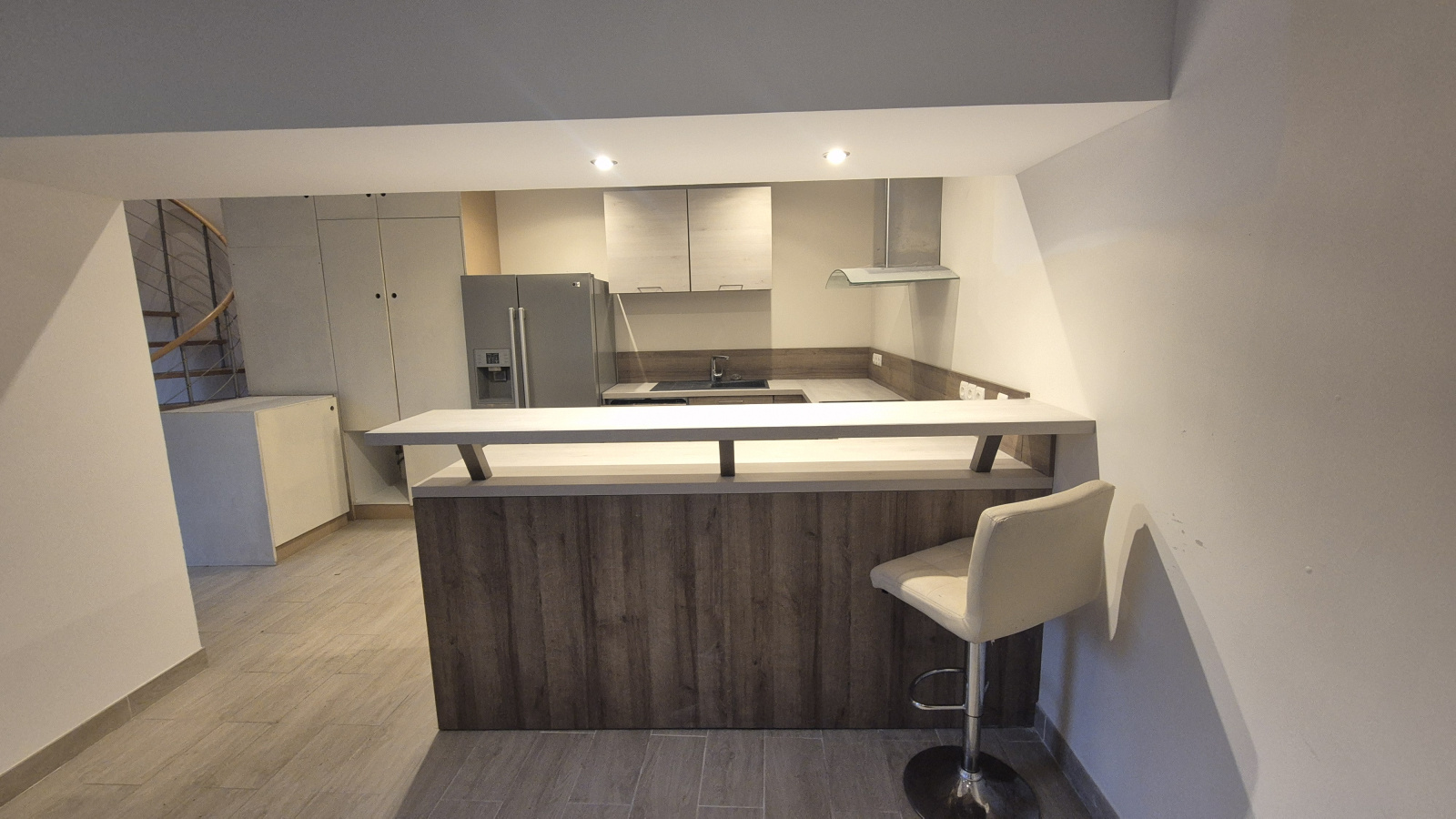 Maison moderne en centre ville, à l'abri des regards et des nuisances offrant une entrée sur un vaste séjour, une belle cuisine aménagée et équipée ouverte, une salle de bains avec douche et wc.